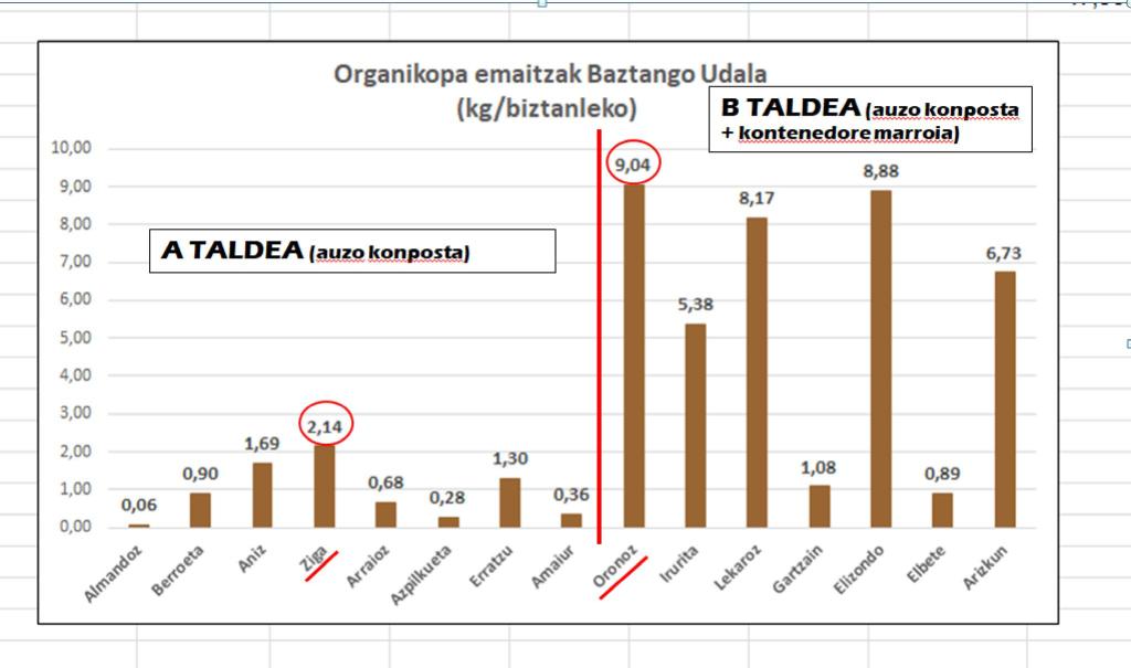 En Baztan, dada su realidad, han puesto en marcha dos competiciones paralelas. Por un lado (grupo A) se contabilizan los residuos orgánicos generados por los y las vecinas de las poblaciones con una o dos zonas de compostaje comunitario y sin contenedores marrones y, por otro lado, (grupo B) compiten entre sí las poblaciones con posibilidad de depositar los restos orgánicos generados en contenedores marrones además de en compostadores comunitarios.