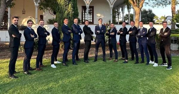 Carlos Fernández, delantero de la Real Sociedad, celebró este viernes su boda con su novia Blanca, en tierras sevillanas. Las fechas del evento han coincidido con los compromisos internacionales de varios jugadores txur-urdin, lo que no ha impedido que una amplia representación de la plantilla viaje a Andalucía con motivo del festejo. Hasta doce miembros del plantel, incluyendo al propio Carlos, estuvieron presentes, como se aprecia en la imagen que acompaña estas líneas. En ella se aprecia a Brais, Aihen, Illarra, Gorosabel, Zubiaurre, Remiro, Diego Rico, Oyarzabal, Guevara, Turrientes y Navarro. También se aprecia en la imagen a Portu y Zaldua, quienes militan actualmente en Getafe y Cádiz respectivamente, y no figura en la instantánea un Nacho Monreal que acudió igualmente al enlace.