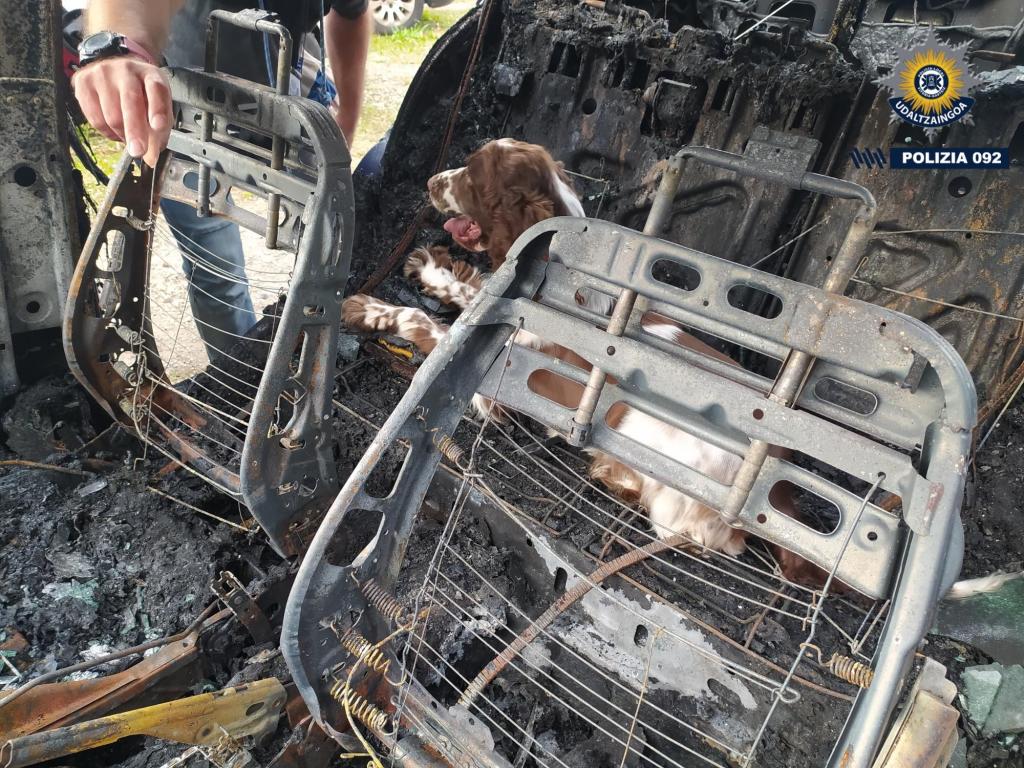 Un agente canino investiga el coche incendiado. Para aclarar estos hechos, la Unidad de Investigación de la Policía Local cuenta con la colaboración de la Unidad Canina de la Ertzaintza que ha inspeccionado el vehículo siniestrado con ayuda de uno de sus perros.