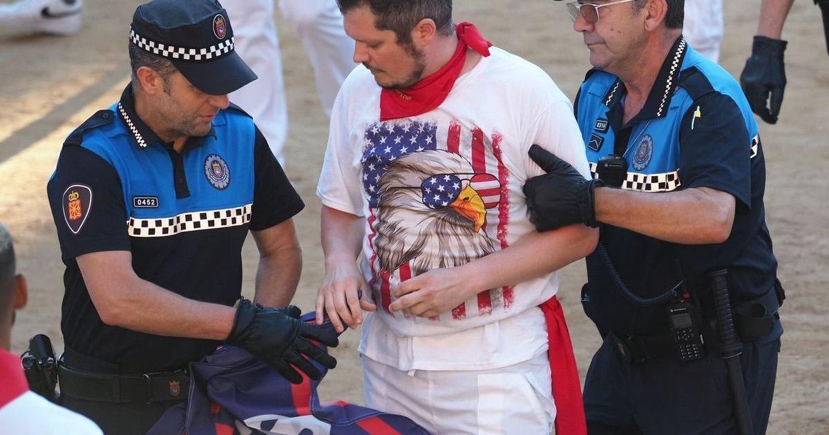 La Policía Municipal de Pamplona ha retirado una bandera de 'DeSantis for president' en la suelta de vaquillas de la plaza de Toros este martes, tras el sexto encierro de San Fermín, protagonizado por los Jandilla.
