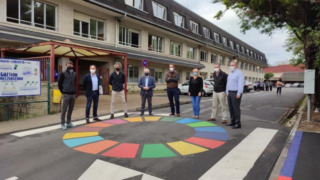 El pavimento empleado para construir esta acera se compone de una mezcla caliente que incluye botellas de plástico (PET). Además de la acera, Axular Lizeoa ha colocado también varios bancos y papeleras elaborados a partir de tapones de plástico.