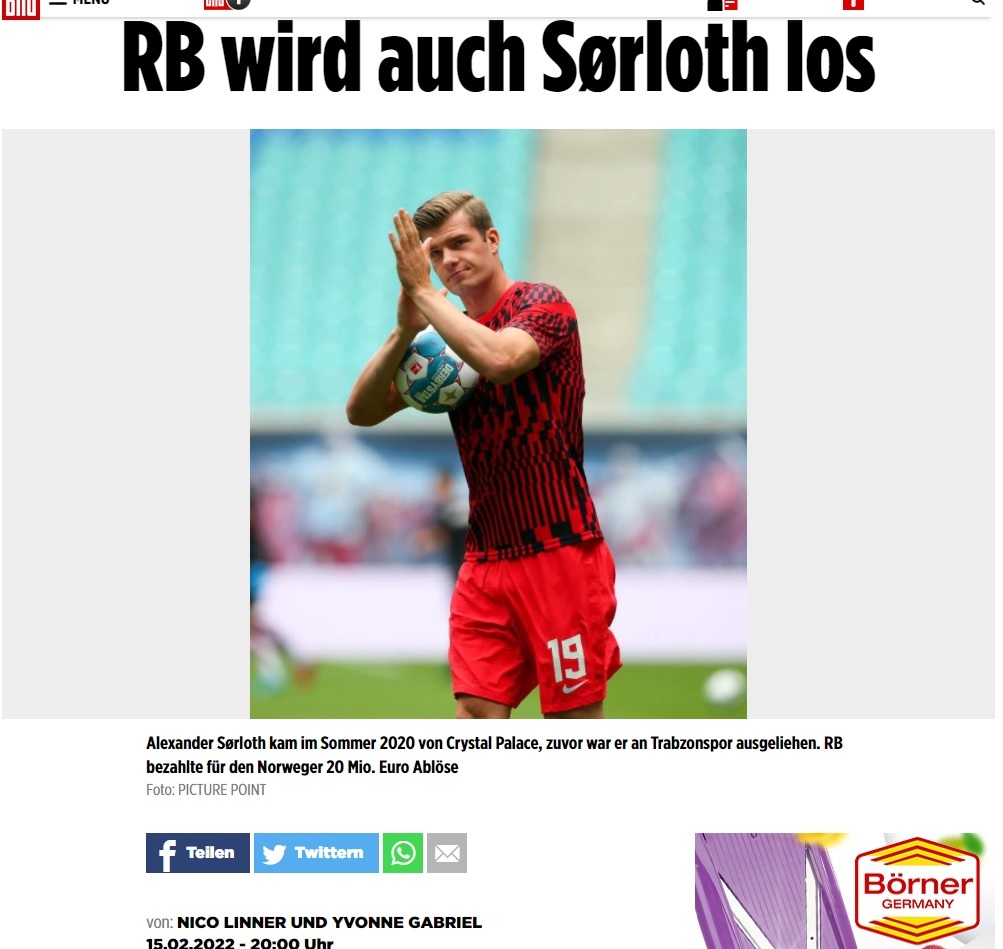 En las páginas de Bild hablan de la vuelta de Sorloth a Alemania, pero señalan que el regreso será "corto". El atacante blanquiazul no entra en los planes del Leipzig pese a que en el verano de 2020 hizo un importante desembolso económico por el gigantón noruego de 20 millones de euros, pero su aportación se redujo a 6 goles en 37 partidos.