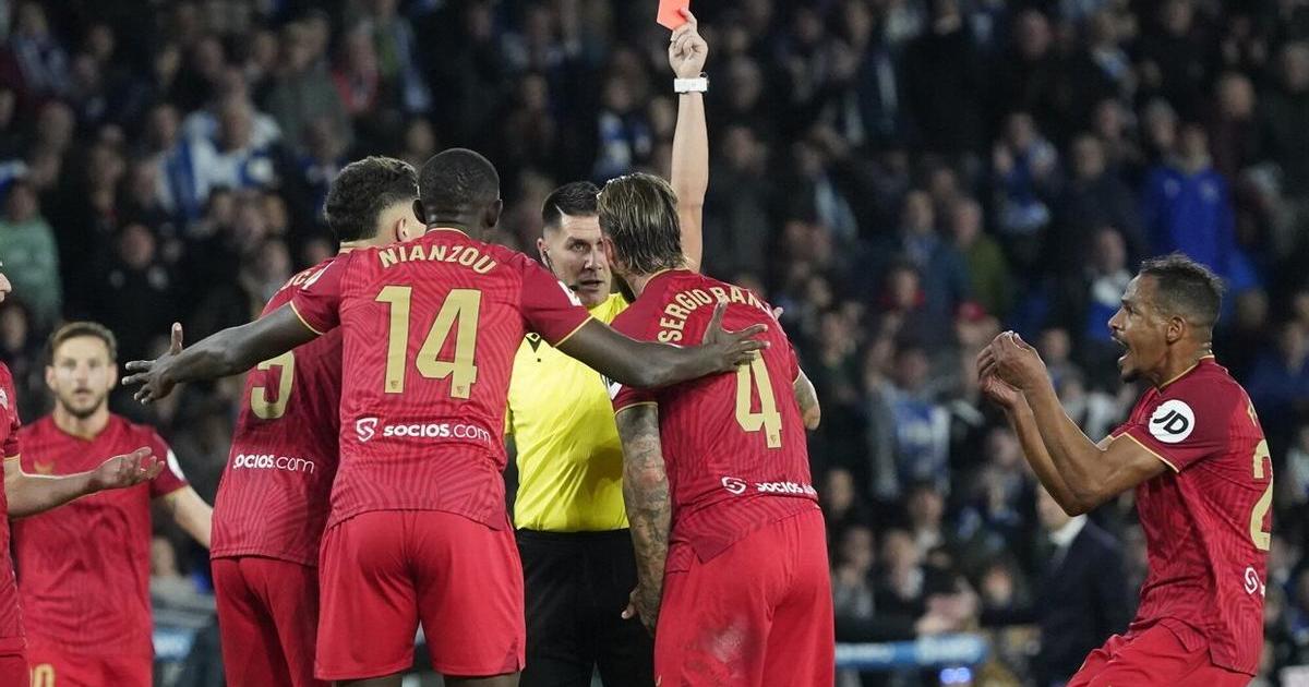 Ortiz Arias expulsa a Sergio Ramos en el partido entre la Real y el Sevilla. / RUBEN PLAZA