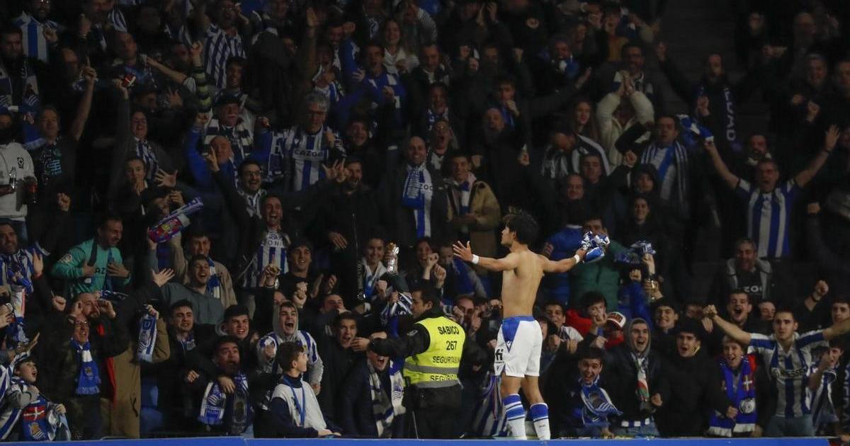 El delantero japonés de la Real Sociedad Takefusa Kubo celebra su gol