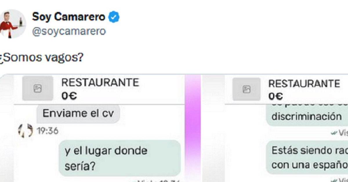 Pues bien, la popular cuenta Soy Camarero, gestionada por el profesional de la hostelería Jesús Soriano, ha mostrado un caso en el que la situación es precisamente la contraria. Una trabajadora española que envía su currículum para un puesto en hostelería y es rechazada. En el post incluyen dos capturas de la conversación que el empleador o empleadora y la aspirante al puesto.