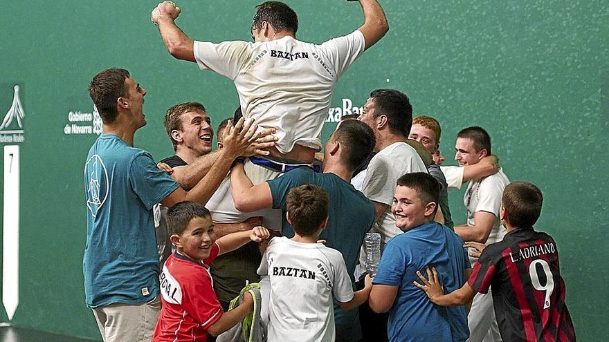 Ninguna pareja era capaz de abrir espacio y los empates se sucedieron hasta el 6-6, momento en el que los de Baztan pusieron una marcha más. Con el 10-7 se fueron al descanso, en el que Gurrea, fruto de la tensión, lanzó una botella contra el suelo mojando parte de la cancha. Eso provocó que el parón se alargase más de lo necesario, algo que repercutió en el juego de los de Larraun de manera positiva. En la reanudación, Armendáriz lideró la remontada a base de remates y grandes saques, llegando al 16-18. Pero el esfuerzo por parte de ambos larraundarras había sido grande y empezó a pasar factura. Seis tantos seguidos azules decantaron el encuentro y la txapela, que viajó hasta Baztan. Una victoria con dedicatoria. “Esto va para la gente de Baztan y por la familia”, señaló Ariztegi, mientras Oscoz se acordaba del delegado Juanjo Atxa: “También va por él”.