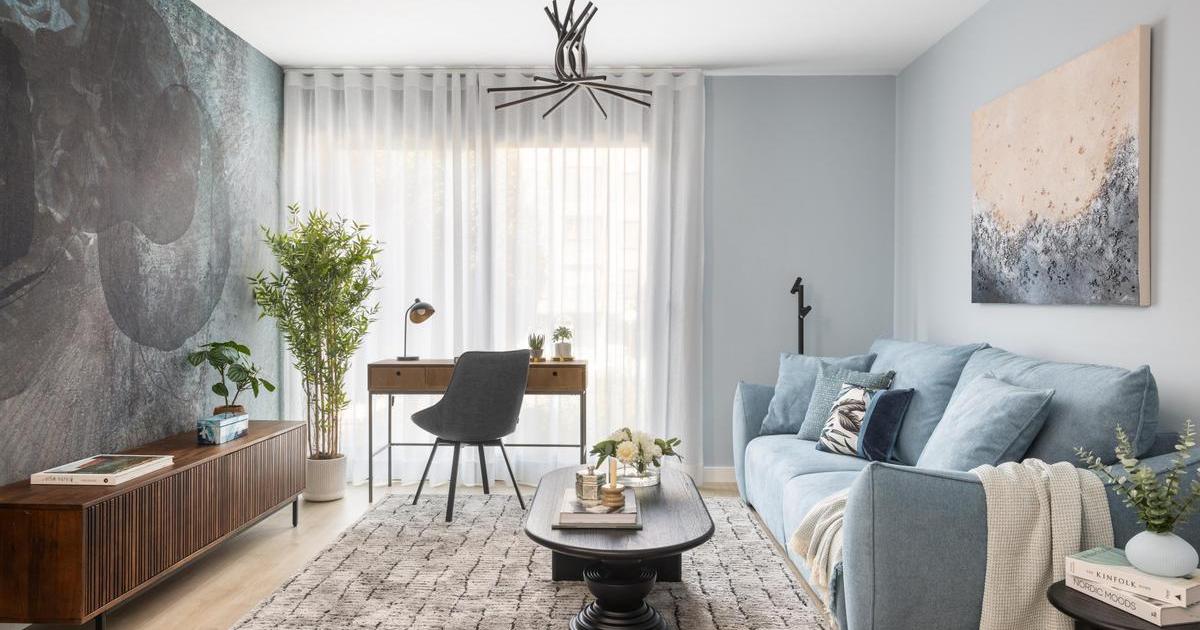 Inspirado en la fusión de lo natural y lo urbano, presenta un papel pintado abstracto en tonos azules y grises, un sofá tapizado en azul denim y una mesa de centro que combina madera, metal y vidrio negro. Elementos como la alfombra de fibra natural y el mueble de ratán aportan textura y calidez, mientras que la obra de arte abstracto sobre el sofá añade un toque de personalidad.