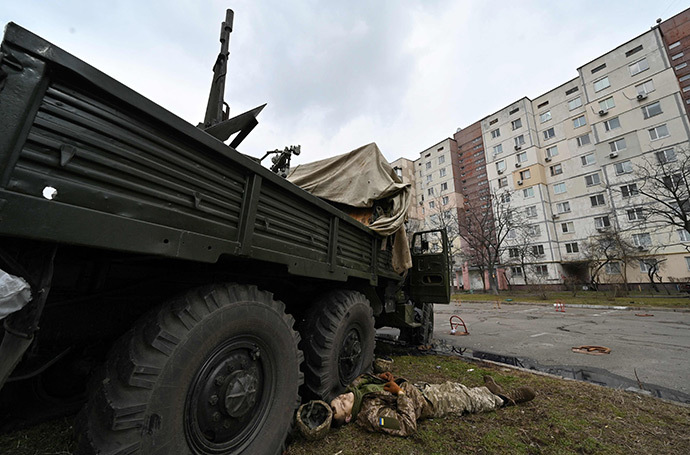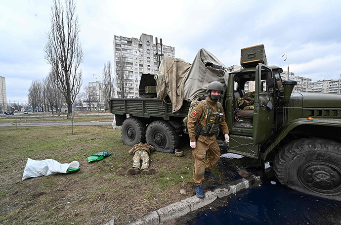 El cadáver de un soldado ruso con uniforme del ejército ucraniano yace en el suelo en Kiev. Foto: AFP