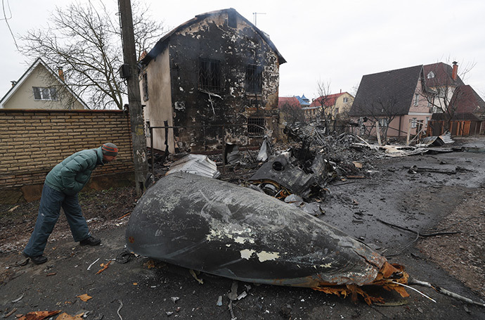 Un hombre observa los restos de un avión militar derribado en la región de Kiev. AFP