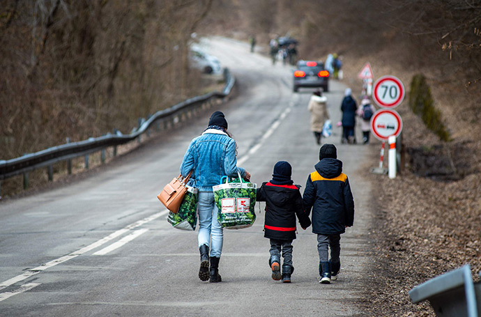 Una mujer abandona Kiev por carretera con sus hijos. Foto: AFP