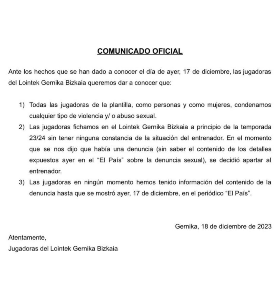 Las jugadores del club de baloncesto de Gernika han asegurado que "en ningún momento" tuvieron información del contenido de la denuncia por presuntos abusos sexuales presentada por una mujer (menor de edad en el momento de los hechos) contra el que era su entrenador, Mario López, hasta la publicación de la noticia este pasado domingo por el diario El País.