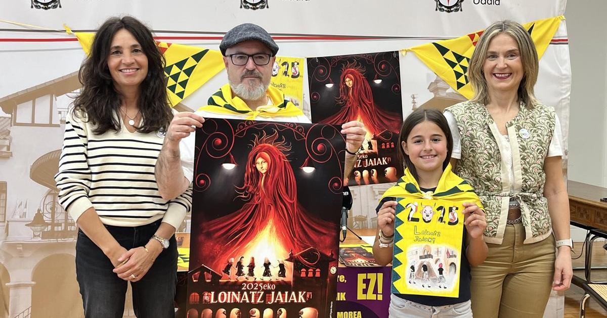 Amaia Gómez de Segura, Luis Ángel Argote, Nahia Altuna y Leire Artola con los carteles de las Loinatz Jaiak de Beasain