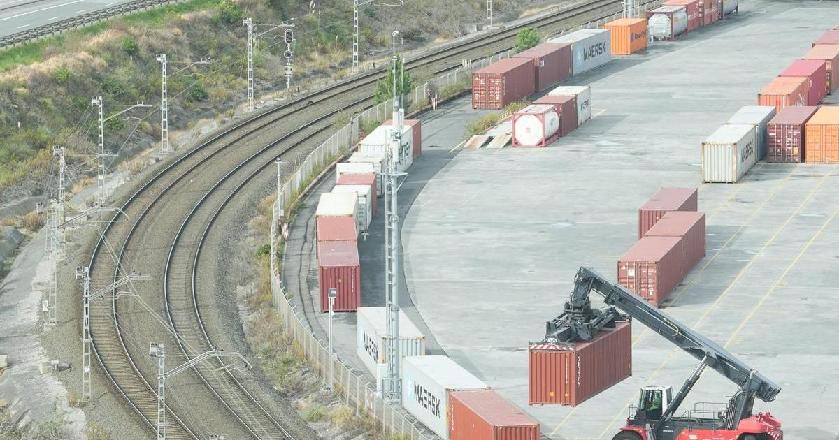 Una grúa mueve un contenedor en las inmediaciones de la playa de vías del Puerto J. M. Martínez
