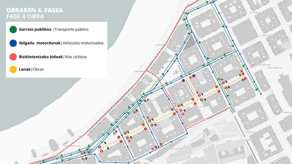 - Excepto Marina y Arrasate, que se cierran, el resto de las calles ya tendrán implantados los sentidos definitivos de tráfico: San Martín, Zubieta, San Bartolomé y las transversales hasta San Martín: Lersundi y Triunfo.