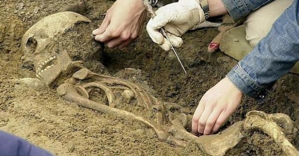 Dos arqueólogos limpian de tierra uno de los esqueletos aparecidos en la excavación de la Plaza del Castillo
