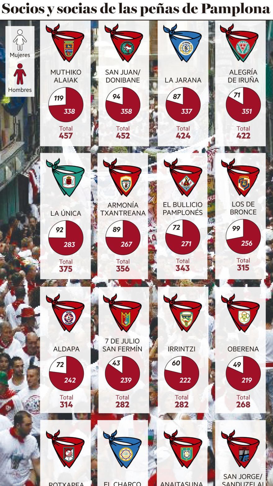 Muthiko Alaiak es la peña con más socios, con 457, seguida muy de cerca por Donibane (452), La Jarana (424) y Alegría de Iruña (422).