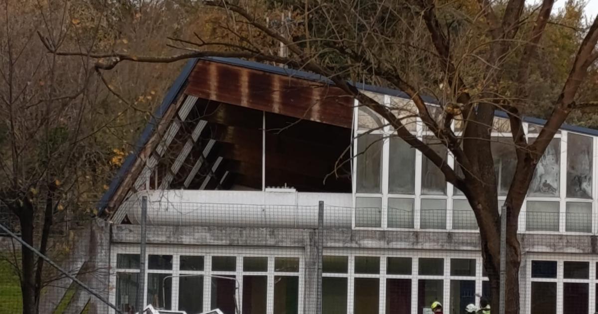 Las fuertes rachas de viento de este martes han provocado diversas afecciones en Euskadi. Un ejemplo es el desprendimiento de parte del cierre en la cubierta de las piscinas cubiertas del Trapagaran que finalmente se han cerrado por seguridad.