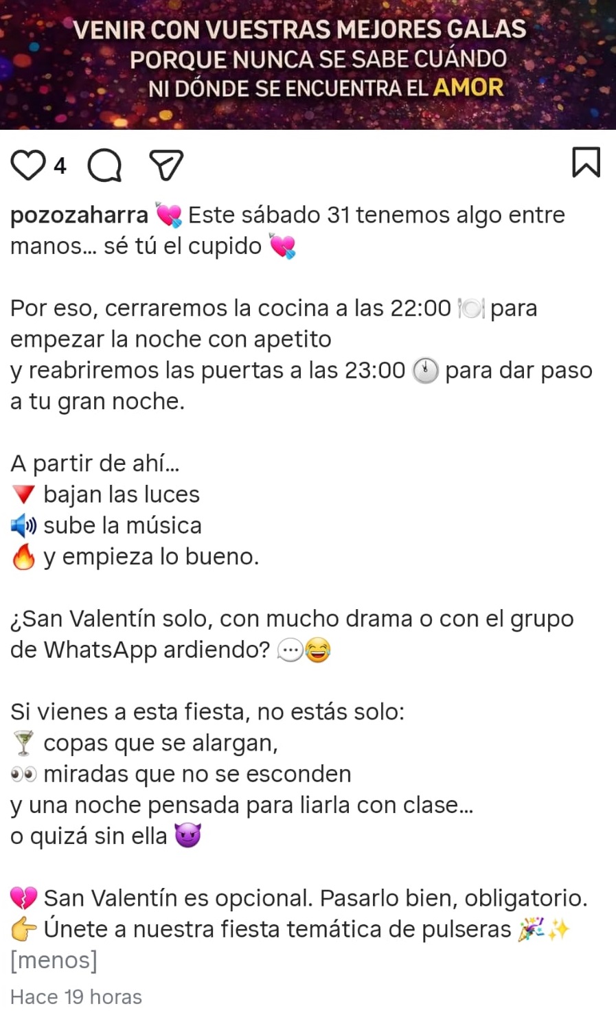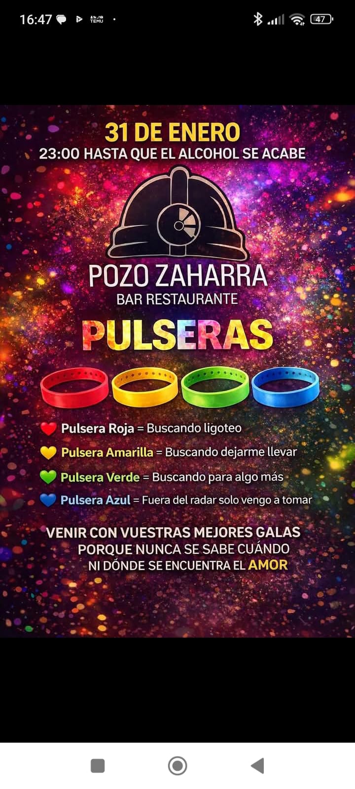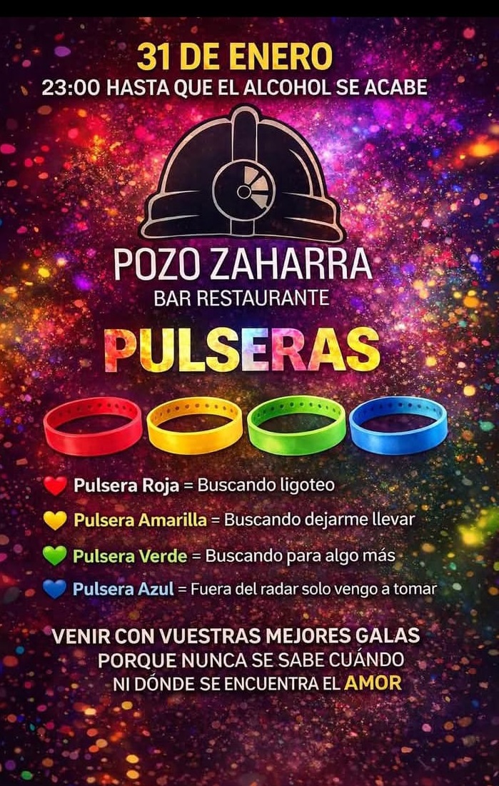 En concreto, el Pozo Zaharra Bar Restaurante se ha propuesto facilitar las cosas a quienes buscan algo más que una copa. Para este fin de semana, el sábado 31 de enero, este local ha organizado un evento especial donde el protagonismo no recaerá solo en la música, sino en un ingenioso sistema de pulseras de colores diseñado para dejar claras las intenciones de cada asistente desde el primer vistazo.