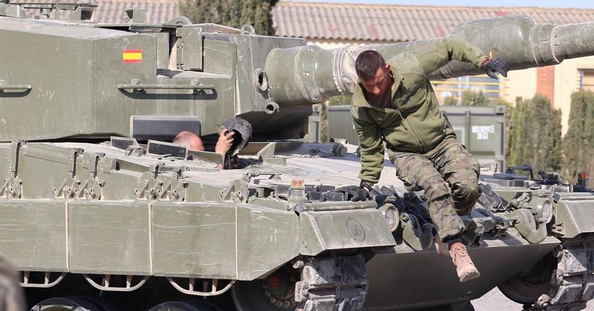 Un militar ucraniano subido en uno de los carros de combate Leopard 2A4 durante la presentación de la formación de las Fuerzas Armadas españolas. / EP