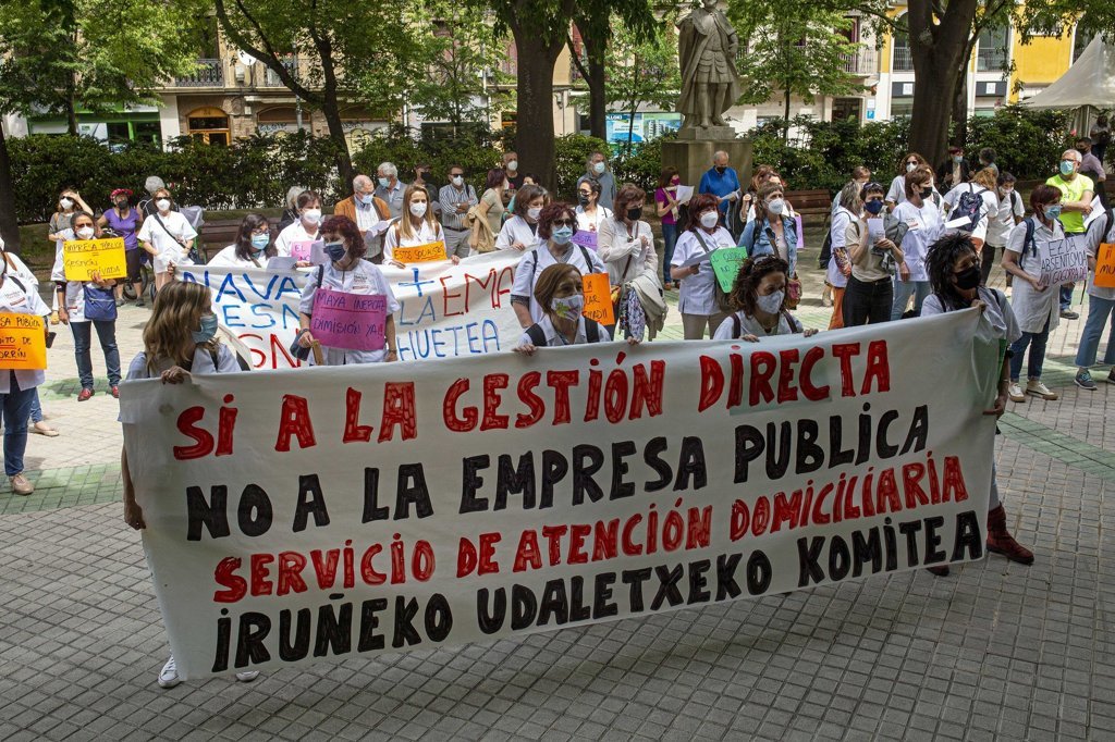 Trabajadoras familiares de Pamplona se han concentrado este viernes frente a la sede del PSN, en el Paseo de Sarasate, para protestar contra la externalización del Servicio de Atención a Domicilio (SAD). Una decisión que Navarra Suma y PSN ratificaron en pleno el pasado mes de abril, y que ejecutará a través de una sociedad mercantil de capital municipal.