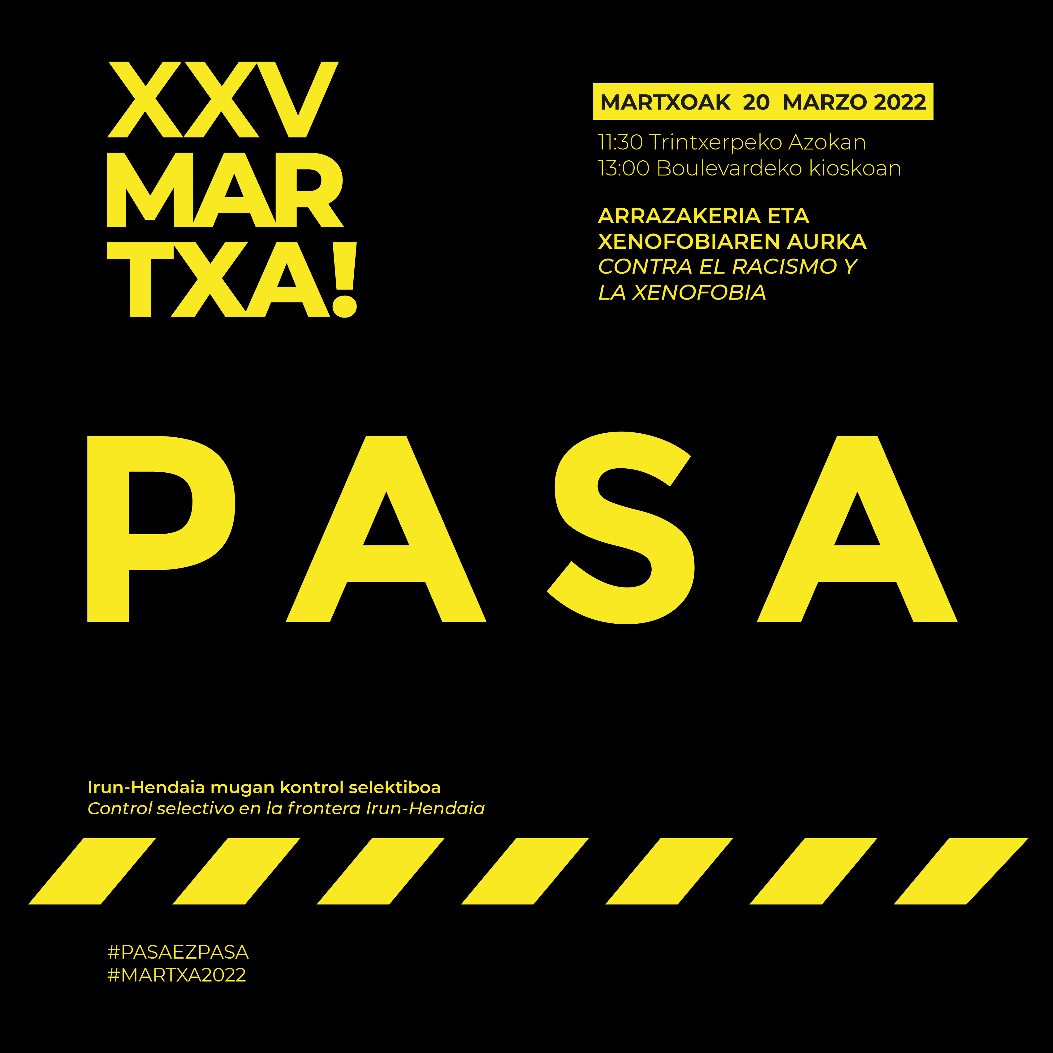 Gipuzkoako Kale Nagusian martxari buruz hitz egin dugu Imanol Legardarekin, SOS Arrazakeriako bozeramailearekin. Aurten mugetan gertatzen ari diren kontrol ilegalak salatu nahi izan dituztela adierazi digu eta, horren isla ekitaldiaren leloa da: Pasa.