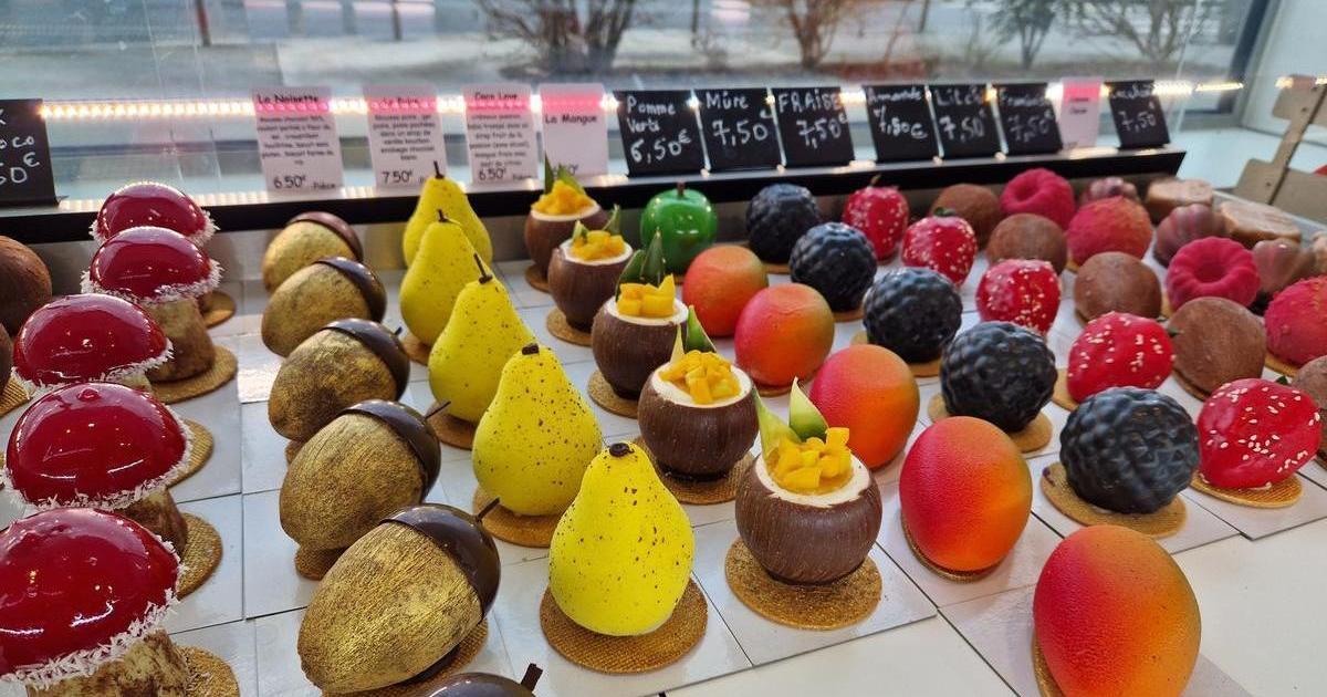 Detrás de su aspecto perfecto se esconden elaboraciones de alta pastelería: una mousse ligera, pralinés finos y coberturas de manteca de cacao teñida, que aportan color, textura y sabor. Los sabores disponibles son los de cacahuete, pistacho y avellana, mango, fresa, frambuesa y coco con maracuyá. Al partirlos, el interior muestra capas de la fruta que imitan.