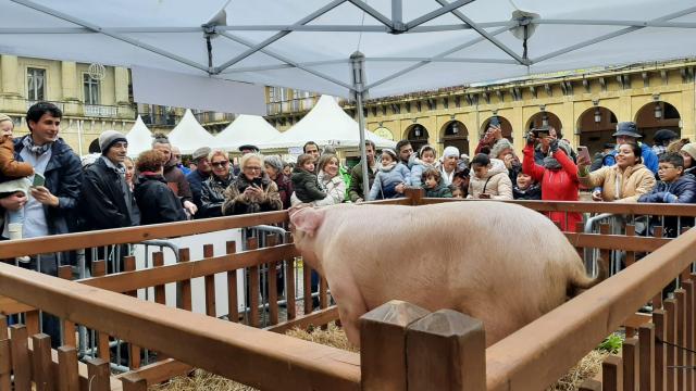 Sin duda, la reina de la fiesta ha sido la cerda Xixili que ha presidido la feria desde la Plaza de la Constitución. Con más de 350 kilos de peso ha hecho las delicias de txikis y mayores. "Acabamos de verla y es muy grande, muy bonita, muy entrañable. Yo creo que estaba todavía dormida, luego nos daremos otra vuelta para ver si ya ha despertado" decía un joven padre con su peque en brazos. Hasta el lugar se acercaba también una madre con otro txiki: "hemos visto que está tumbada y que es muy, muy grande. Vivimos la fiesta con mucha expectación, llevamos un mes pensando en el día de la txistorra; o sea que nos comeremos un talo con txistorra... ¡eso seguro!". Muchos han sido los que han pasado a visitarla por la Plaza de la Constitución.