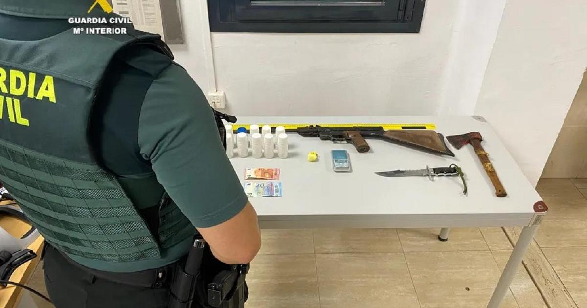 Pero la cosa comenzó a complicarse cuando la Guardia Civil llegó al escenario del presunto robo. Tras escuchar ruidos en una arboleda cercana (probablemente eran los supuestos ladrones escapando), los agentes encontraron dentro de la propiedad del hombre una bolsa con 10 gramos de cocaína, 12 botes de metadona, una báscula de precisión para pesaje, una carabina de aire comprimido, un hacha, un machete militar, bolsas de plástico con recortes y 30 euros en efectivo.