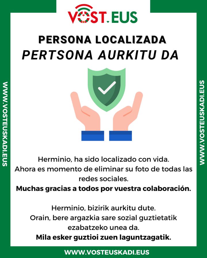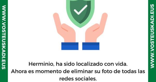 VOST Euskadi, la Asociación de voluntarias/os digitales de emergencias de Euskadi, ha confirmado a través de sus redes sociales que ha sido localizado "con vida" Herminio, el hombre de 83 años que desapareció ayer miércoles en Bilbao, por lo que ahora toca borrar su fotografía de las redes sociales.