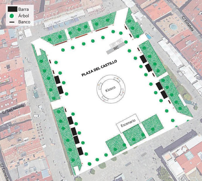 Se instalarán 10 barras de bar, 4 en el lado derecho, donde los baños, y otras 6, en frente, sin agua corriente ni desagüe, que irán colocadas en "el límite interior de los parterres" y mirando "hacia el interior de la plaza" para "conseguir el efecto buscado".