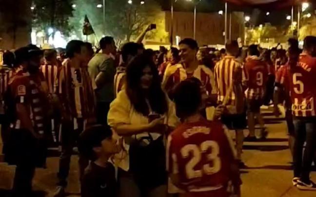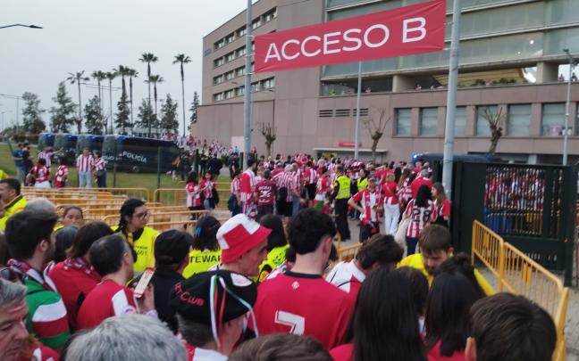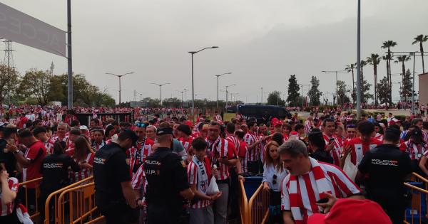 Con los accesos al estadio que acoge la final abiertos, los aficionados rojiblancos desplazados a Sevilla ya han comenzado a entrar al interior del mismo bajo un cinturón de seguridad por parte de agentes.