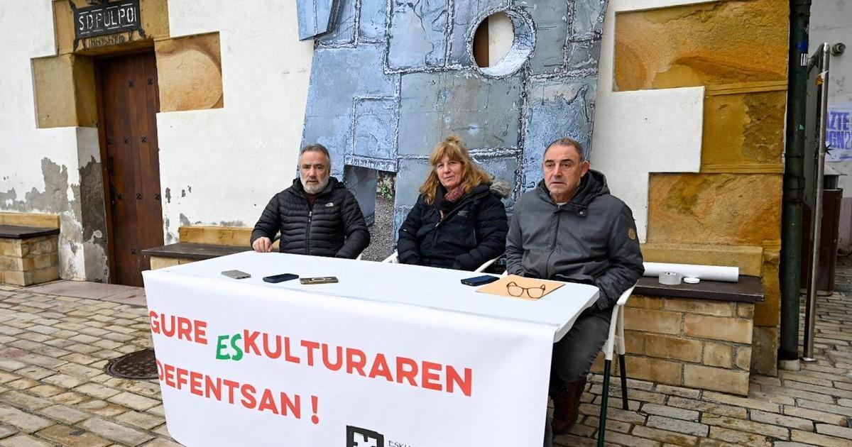 Los autores de la escultura Zinka, Ana Herranz y José Luis González Pazos, junto al presidente de la asociación de escultores vascos Eskuahaldunak, Guillermo Olmo, han denunciado la mañana de este viernes el acto de vandalismo y arrojo a la ría de la obra. También han señalado la falta de implicación del Ayuntamiento de Zumaia tras los hechos.