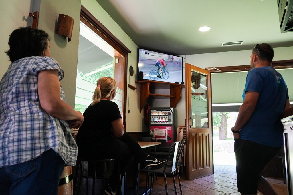 Isa López, Ana Larrazabal y Félix Jungitu siguen la crono de su paisano Mikel Landa desde Ioar Taberna en Murgia Gritos de ánimo