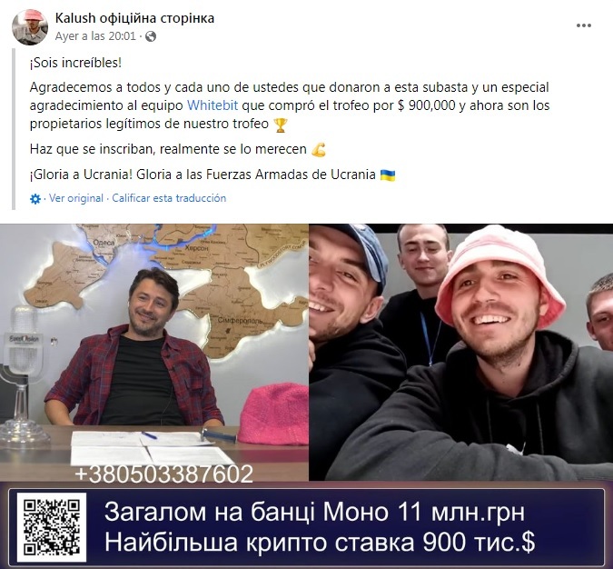 La publicación que el grupo ha subido en su cuenta de Facebook. Varias agencias locales ucranianas afirman que el dinero obtenido en la subasta se destinará a comprar tres drones del tipo PD-2 para combatir a las tropas rusas que invadieron Ucrania el pasado 24 de febrero.