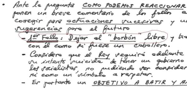 En dicho escrito detallan una serie de recomendaciones para actuar en “acciones sucesivas” y consideran que el rey pretendía seguir adelante con su “intento suicida” de tener un Gobierno con los socialistas. Dichos “militares españoles” afirman por ello que no puede ser considerado “ni como un símbolo a respetar. Es por tanto un objetivo a batir y anular”. Añaden que los militares “no están decepcionados por los acontecimientos del 23-F y que no es el momento de hacer críticas de lo que debieron hacer los heroicos camaradas de armas y sí en cambio analizar qué es lo que habrá que hacer de ahora en adelante”.