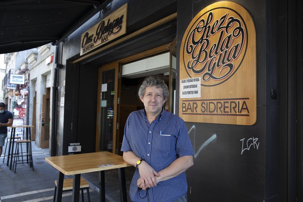 Juan Carlos Oroz, en el bar sidrería Chez Belagua, que tiene terraza en la plaza de toros.