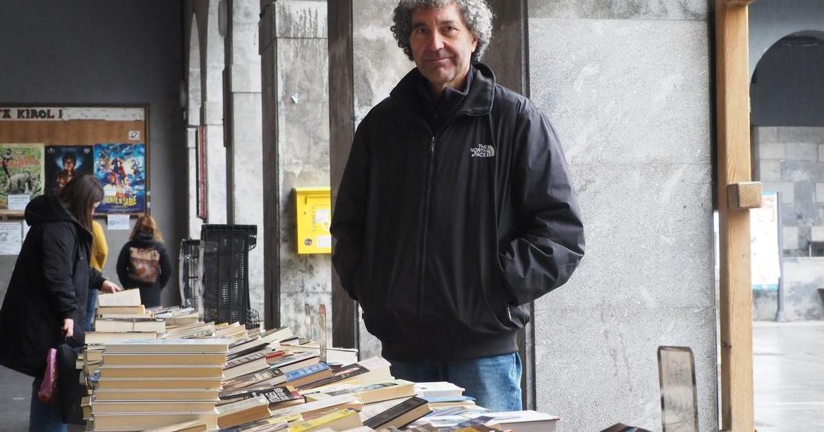 Jorge López, en el puesto de venta de libros y discos de segunda mano que la asociación Kaleko Elkartasun eta Kultur Elkartea instaló en Azkoitia hace unos días.