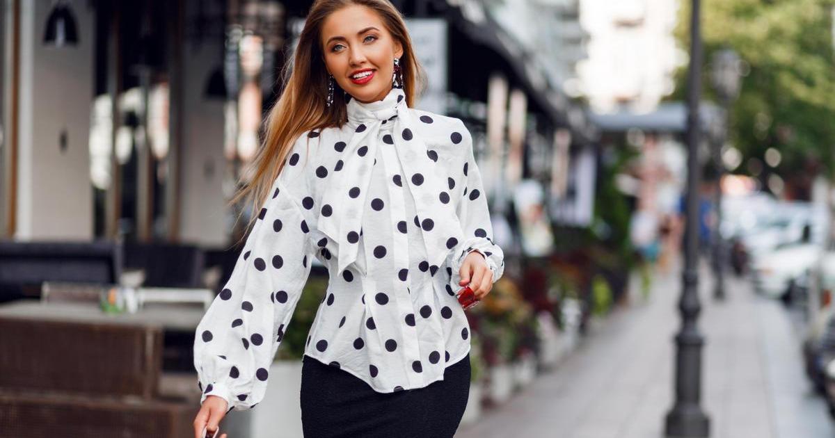 Para quienes prefieren incorporar la tendencia sin que nadie lo note demasiado, una blusa de topitos pequeños en tono neutro —negro sobre blanco o blanco sobre beige— combinada con un pantalón de vestir recto es la opción perfecta.