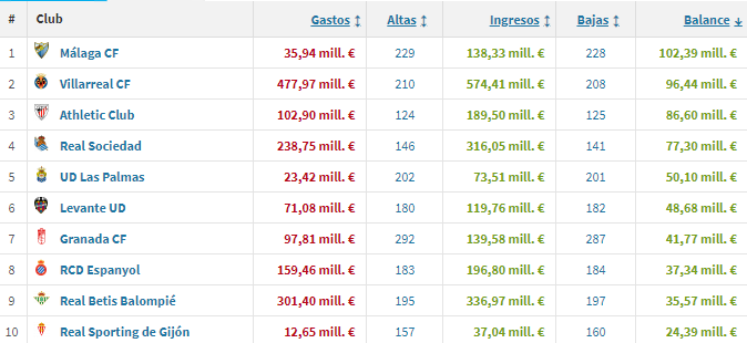 La inversión, por contra, no ha sido tan radical como el ingreso debido a la política de economía inteligente de Jokin Aperribay. La Real ha gastado 238,75 millones en la última década, lo que restado a los ingresos deja un balance positivo de 112 millones de €, pasando a liderar la lista de clubes con mejor balance. Esta es la clasificación según TransferMarkt donde la Real todavía se mantiene cuarta.