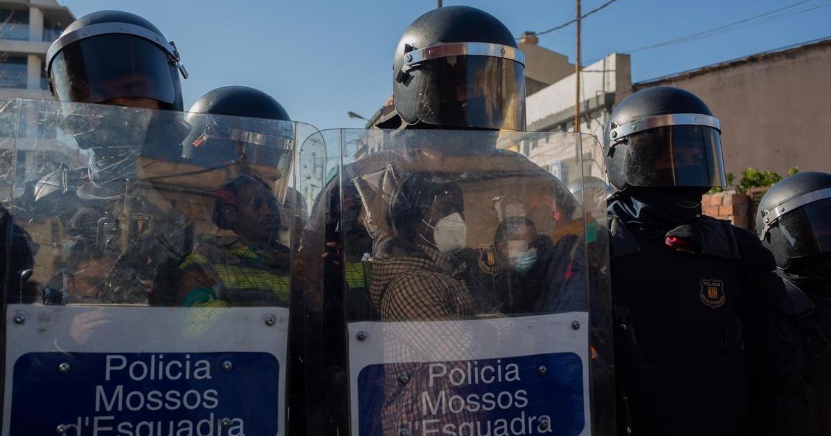 Los Mossos inician el desalojo del antiguo instituto B9 de Badalona.