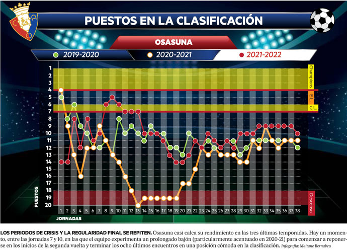 Ninguna jornada en puestos de descenso. Temporada sin apenas apuros por el puesto en la clasificación. Osasuna no ha ocupado posiciones de descenso. El lugar más alto ha sido el quinto y el más bajo, el decimocuarto. En seis jornadas el equipo ocupó plaza de acceso a competición europea. El puesto más repetido ha sido el décimo.