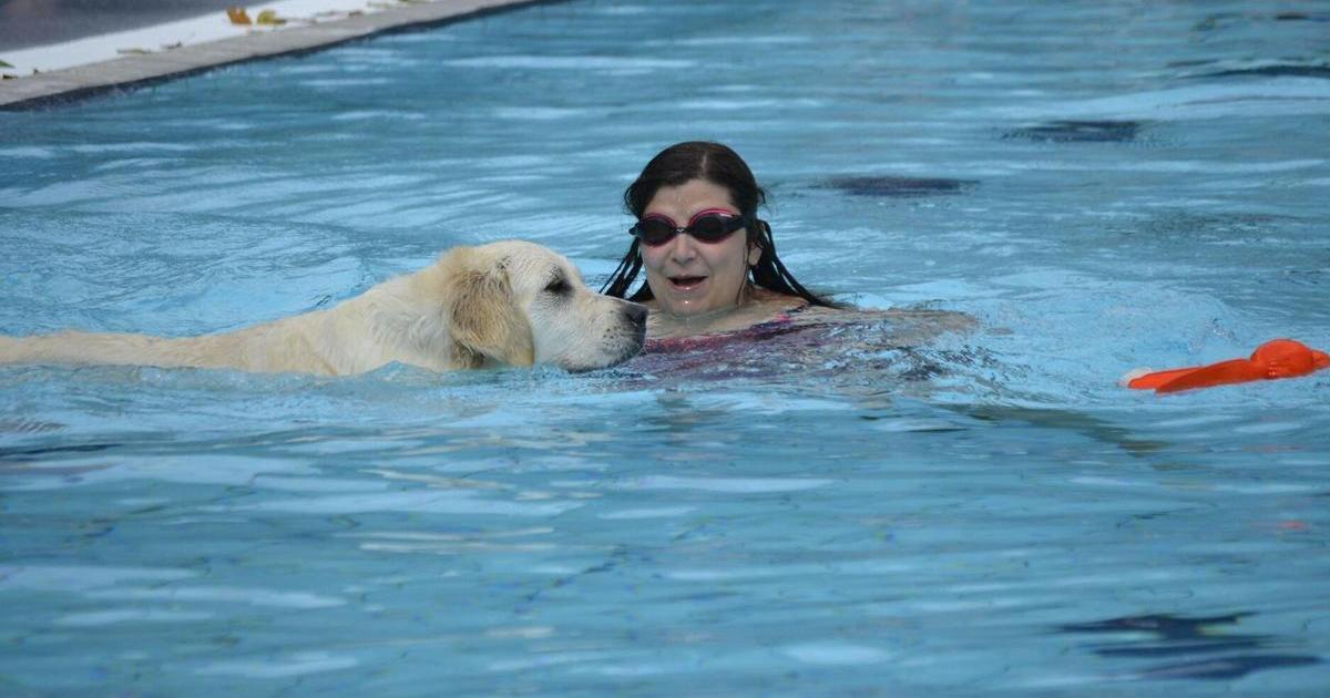Una mujer se baña junto a un perro en una piscina alavesa coincidiendo con el final de la temporada de verano. / DNA