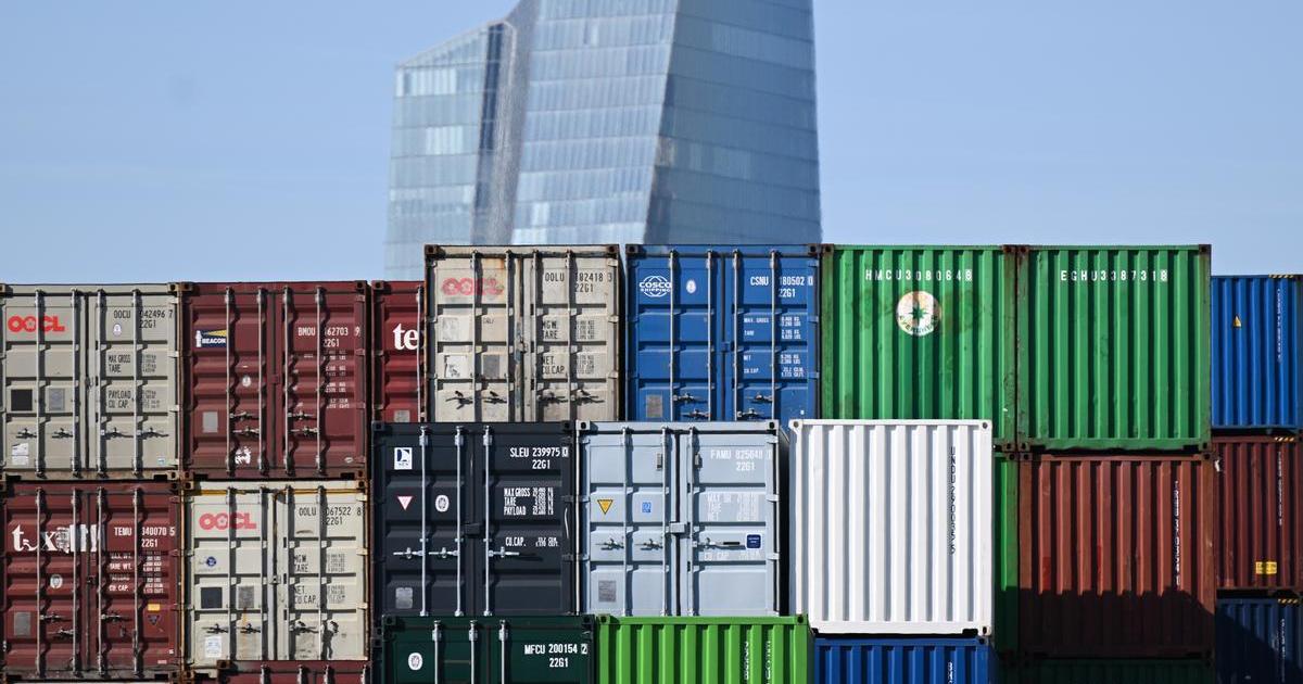 Contenedores de mercancías en el puerto seco de Frankfurt, y detrás de ellos la sede del Banco Central Europeo. / EP