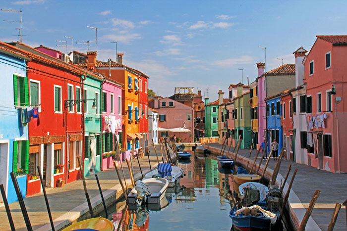 Cerca de Venecia, Burano es famosa por sus casas pintadas de colores vibrantes que reflejan la luz sobre los canales de la isla. Además de su belleza visual, Burano es conocida por su tradición en la elaboración de encajes, lo que le añade un toque artesanal a su encanto.