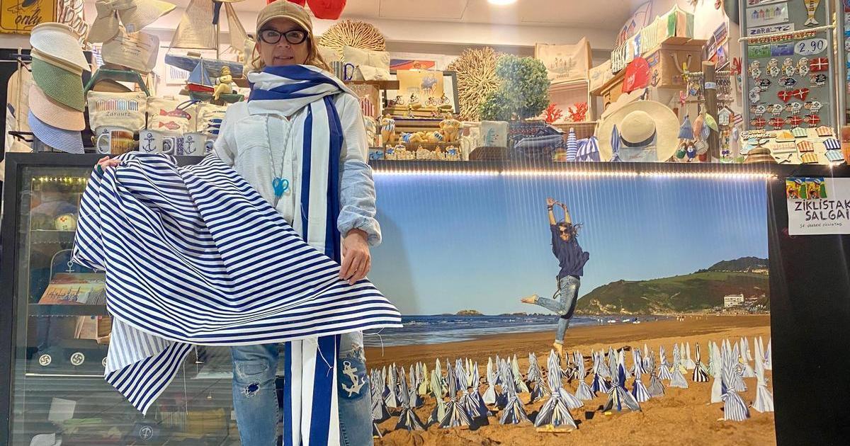 La zarauztarra Maite Isasti lleva una década vendiendo artículos y productos relacionados con su pueblo. Su tienda está situada en el piso inferior del mercado, junto al ayuntamiento y frente a la Oficina de Turismo. Nada más pasar por allí llaman la atención los coloridos delantales de cocina, bolsas, trapos, mochilas, llaveros... todos ellos hechos a mano y bordados con el nombre de Zarautz o, incluso, personalizados. Pero lo que verdaderamente capta todas las miradas es la recreación artesanal de los icónicos toldos de la playa.