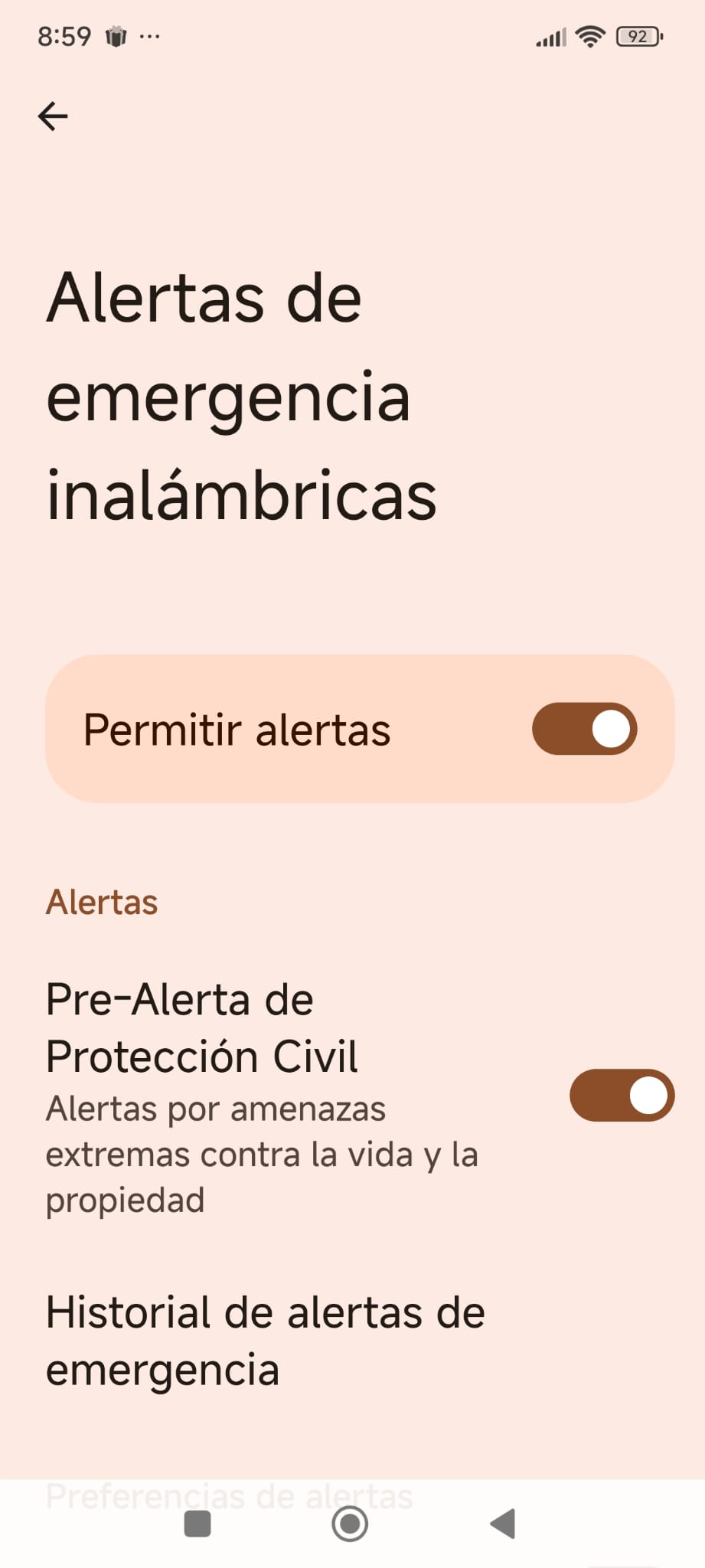 - Activa las alertas: habilita las opciones de alertas disponibles, como Alertas de Protección Civil o Alertas de emergencia, según las categorías que desees recibir.