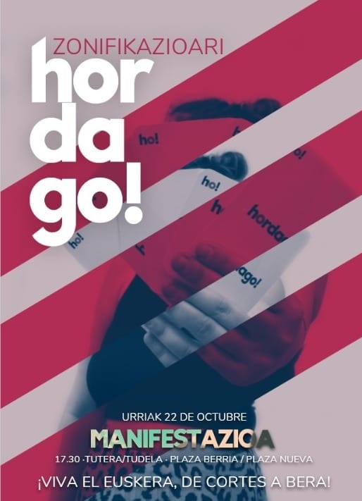 El colectivo Hor Dago! ha convocado a las 17.30 una manifestación contra la zonificación ante la enseñanza en euskera. Considera que la actual normativa "impide vivir en euskera en libertad en toda Navarra". Bajo el lema ¡Viva el euskera de Cortes a Bera!, la marcha partirá de la plaza Nueva de la capital ribera y sus organizadores han hecho hoy un llamamiento a la participación de la ciudadanía de toda la Comunidad Foral.