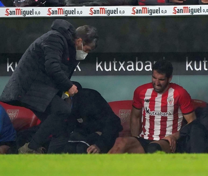 Raúl García se duele en el banquillo tras ser sustituido. Anoche, la nota negativa la protagonizó Raúl García, quien tuvo que ser sustituido en el minuto 63 tras ver cómo Adrià Pedrosa le clavaba los tacos en su pierna derecha.