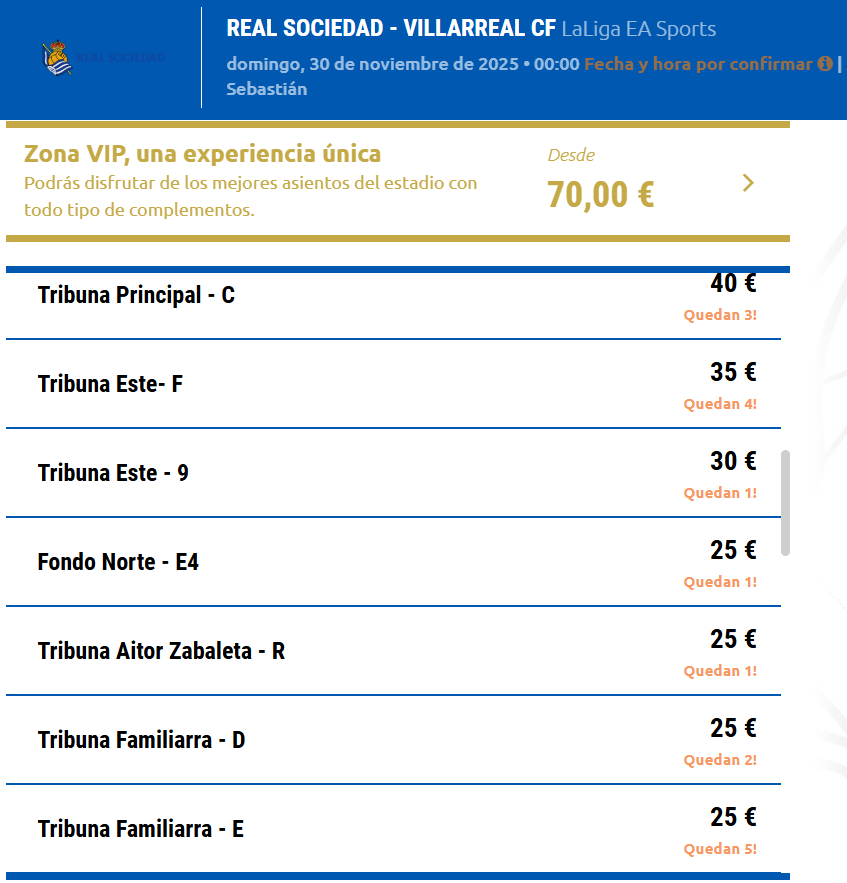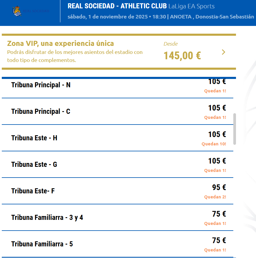 Actualmente, los billetes más baratos se sitúan en estos momentos en 95 euros y el precio de lanzamiento a menor importe era de 75€, 50€ más caras que las que se ofertan ya para el partido ante el Villarreal.