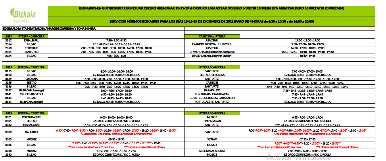 No será el único día con paros parciales en Meatzaldea y Ezkerraldea ya que los trabajadores interrumpirán el servicio en esas mismas franjas horarias este jueves día 15 y el lunes 19 de este mes.